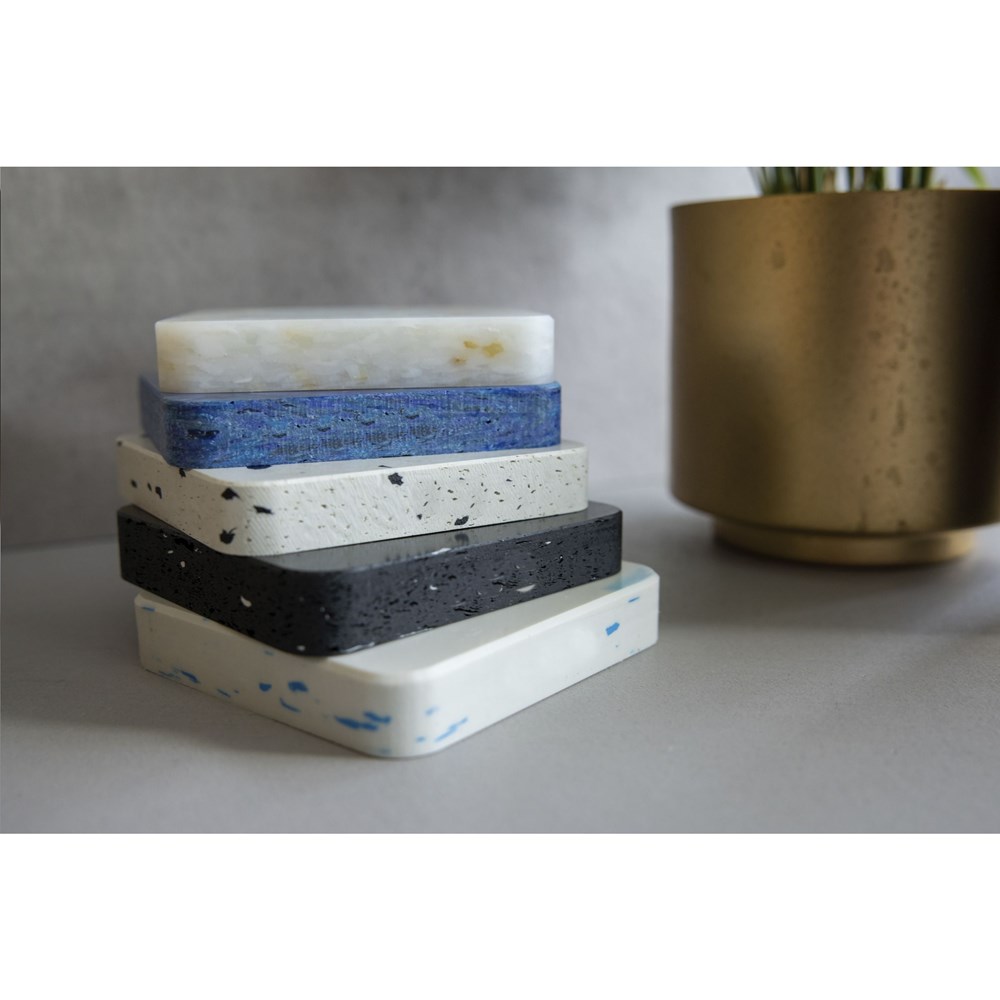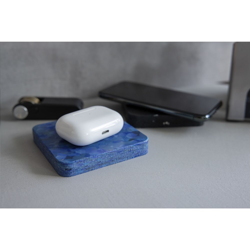 Dieses kabellose 10W-Telefonladegerät besteht aus alten blauen Druckerspulen. Der Kunststoff wird gereinigt, geschreddert und anschließend zu Platten geformt und gepresst. Aus diesen Platten werden die Docks gefräst. Jedes Produkt hat sein eigenes einzigartiges Muster. Inklusive Micro-USB-Ladekabel und USB-C-Anschluss. Wird einzeln in einem Kraftkarton geliefert.