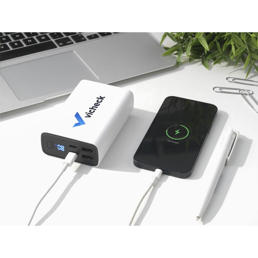 Sehr leistungsstarke Powerbank mit integriertem 20.000-mAh-Lithium-Polymer-Akku. Das Gehäuse besteht zu 100% aus RCS-zertifiziertem recyceltem ABS. Mit Ein-/Aus-Taste und Display mit prozentualer Akkuanzeige. Typ-C-Eingang: DC5V/3A, 9V/2A, 12/1,5A. Typ-C-Ausgang: DC5V/3A, 9V/2,22A, 12/1,67A. USB-A-Ausgang: DC5V/3A, 9V/2A, 12/1,5A. Kabelgebundener Ausgang: 22W. Inklusive rTPE USB-C-zu-USB-C-Ladekabel und Gebrauchsanweisung. Verpackt pro Stück.