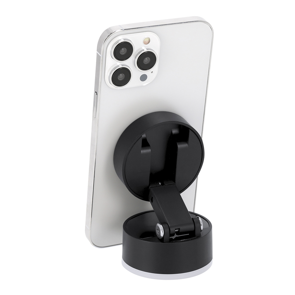 Magnetischer Telefonhalter in ABS. Saugnassbefestigung mit EIN/AUS-Ein/Aus-Ein/Aus-Knopf. Beinhaltet einen magnetischen Metallring. Er verfügt über einen verstellbaren einziehbaren Ständer, ideal als Lösung, um Ihr Gerät stabil und vielseitig auf jeder Oberfläche zu sichern.