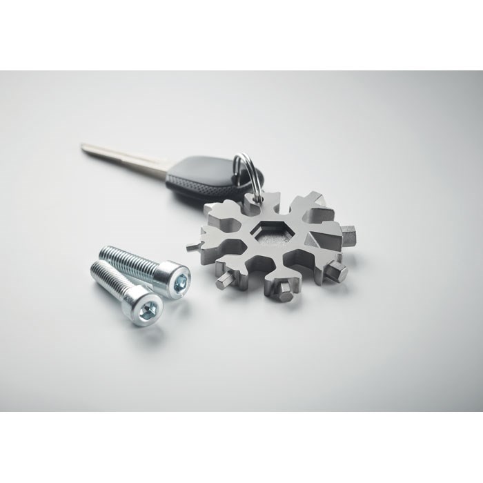 Multifunktionstool 17-in-1 aus Edelstahl. In Form einer Schneeflocke. Inkl. abnehmbarem Metallring.
