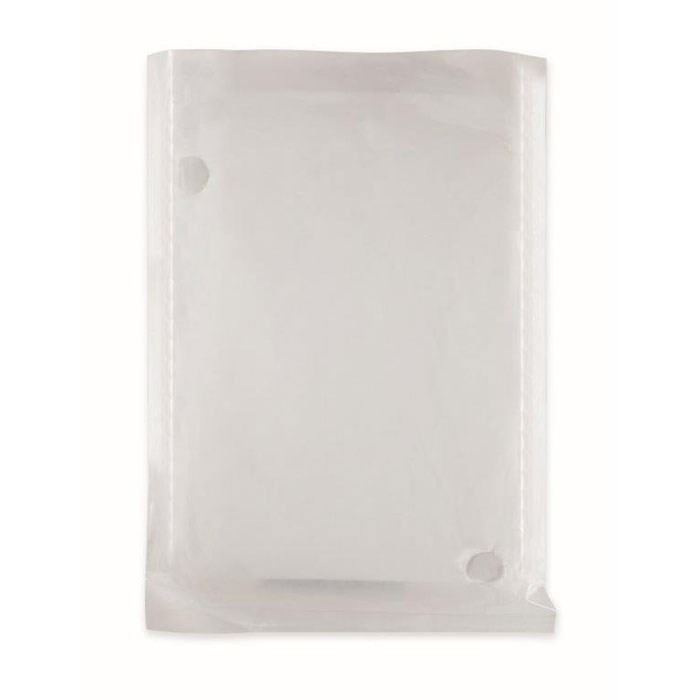 Regenmantel mit Kapuze. Praktisch, klein gefaltet. Verpackt in einem transparenten Polybeutel. Mantel und Polybeutel aus natürlich abbaubarem PLA (auf Maisbasis).