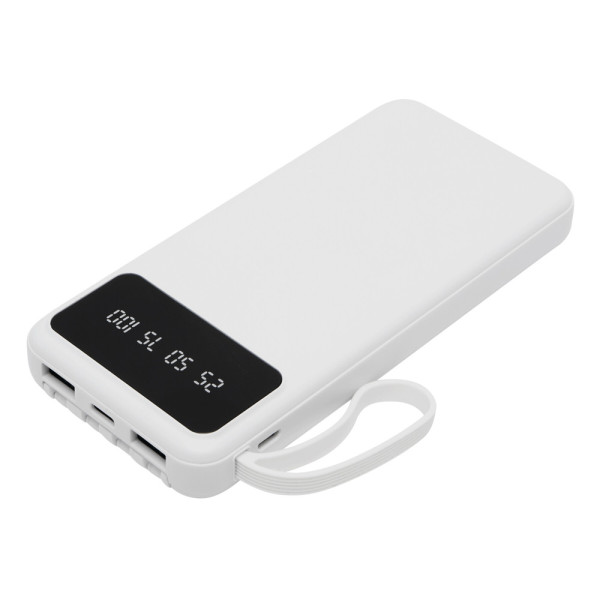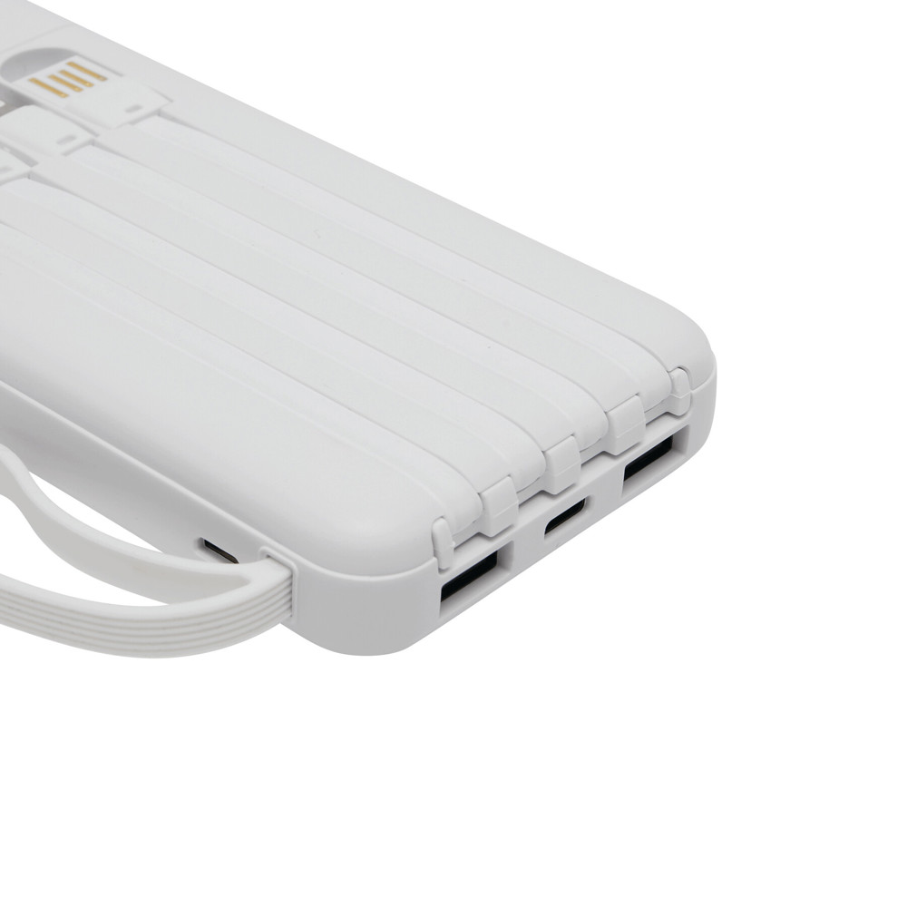 Powerbank MULTI CHARGE: geeignet für Smartphones und USB-betriebene Geräte, inkl. 4 integrierter Ladekabel auf der Rückseite (USB Typ C, Micro-USB, Lightning®, USB Typ A), mit Ladestandanzeige (25 / 50 / 75 / 100 %), Ein- und Ausschalter, je 1 USB Typ C und Micro-USB Eingang und 2 USB Typ A Ausgänge, Eingangsleistung: 5V/2A, Ausgangsleistung: 5V/2A (max.), Kapazität: 10.000 mAh, leistungsstarker Lithium-Akku, mit ausziehbarem Smartphone-Halter, in Box